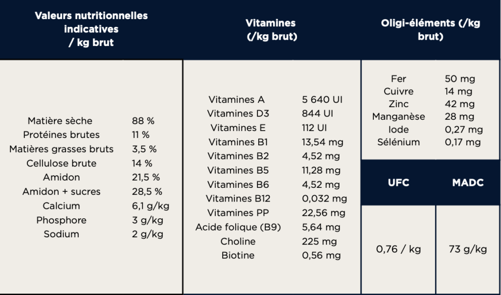 Apport de vitamines et de minéraux contribuant à la couverture des besoins selon les recommandations de l’INRAE ou du NRC