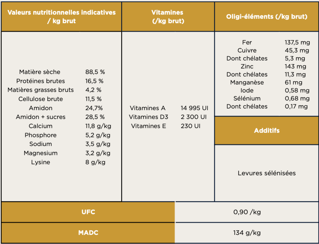 • Source de vitamines A et E qui interviennent dans la reproduction, conformément aux recommandations de l’INRAE ou du NRC