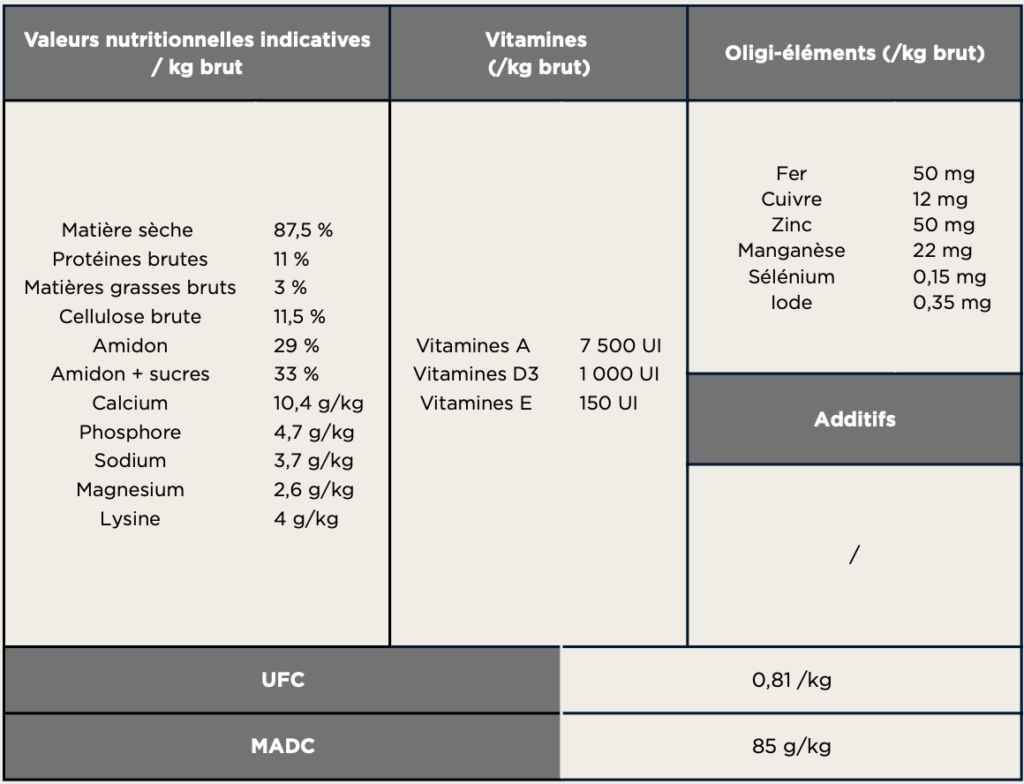 - Apport de vitamines et minéraux contribuant à la couverture des besoins selon les recommandations de l’INRAE ou du NRC
