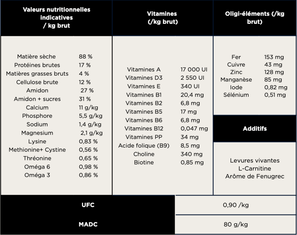 Contient plus de 20% de luzerne 17 cheval. Contient de la L-Carnitine