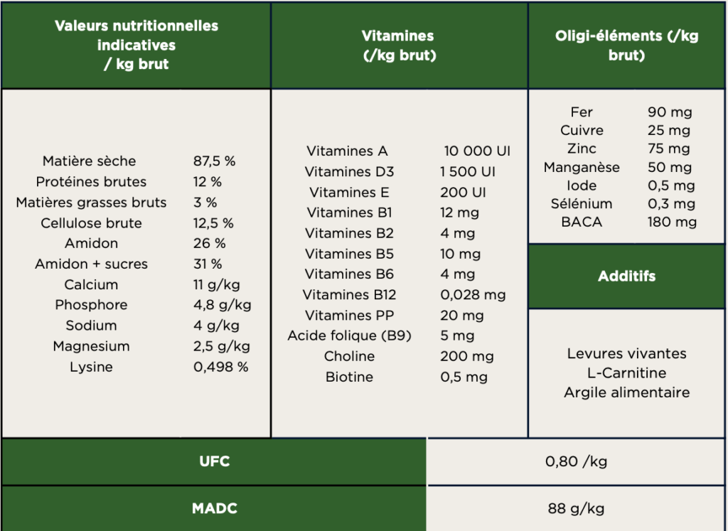 • Apport en vitamins et minéraux contribuant à la couverture des besoins selon les recommandations de l’INRAE ou du NRC